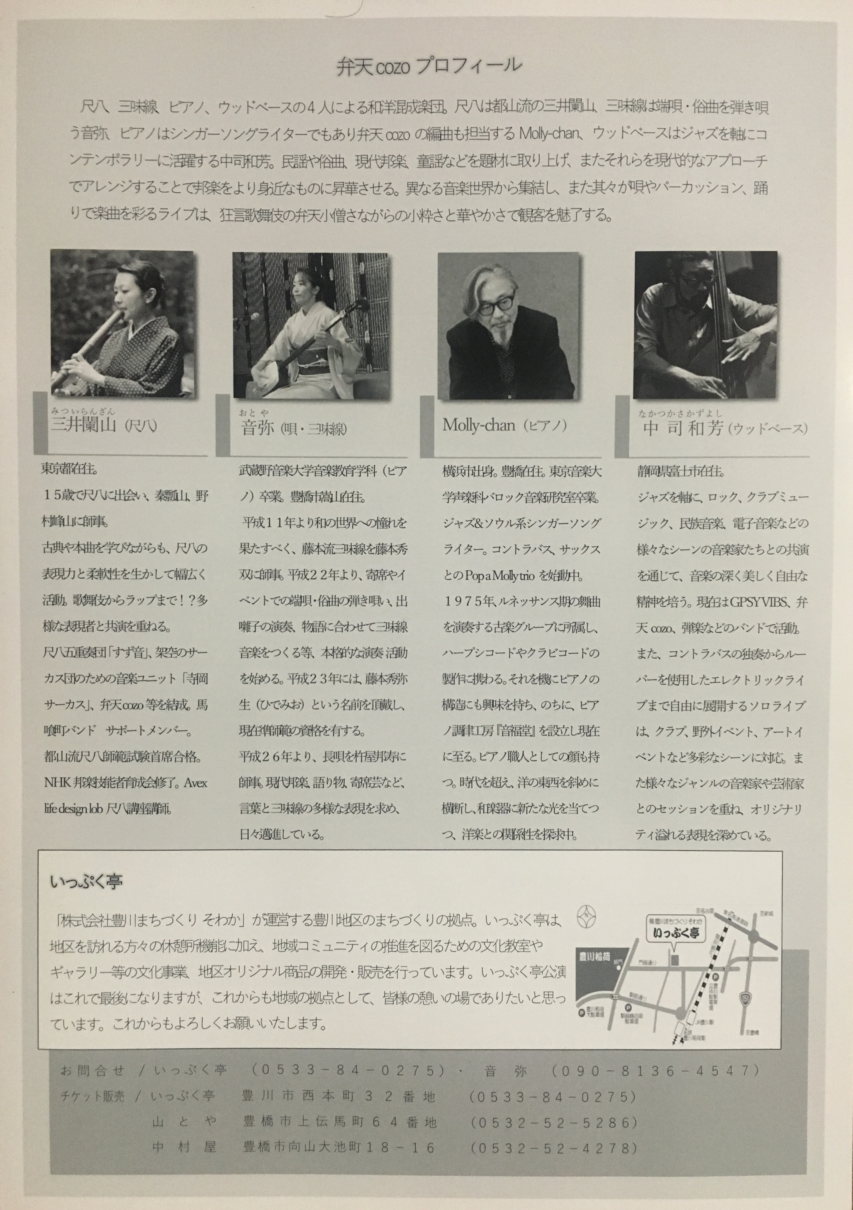 最後を飾ってくれる演者は、尺八・三味線・ピアノ・ウッドベースからなる和洋混成楽団『弁天cozo』